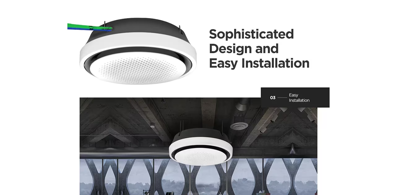 تعمل مكيفات كاسيت الدائرية من إل جي على زيادة انفتاح المساحة بمجرد تثبيتها من خلال تقليل ارتفاع المنتج. يبلغ ارتفاع المكيف 330 سم فقط. علاوة على ذلك، يتم وضع أنبوب التصريف وأنبوب التبريد معًا في مكان واحد بالوحدة لتقليل ظهور الأنابيب وعيرها من المكونات. توفر أغطية التعليق شكلا جماليا أكثر دقة للتركيبات. هذا التصميم المتميز مناسب تمامًا للمساحات العصرية الفاخرة مثل الفنادق والمطاعم والمقاهي والمتاحف ومتاجر الأثاث والملابس الراقية.